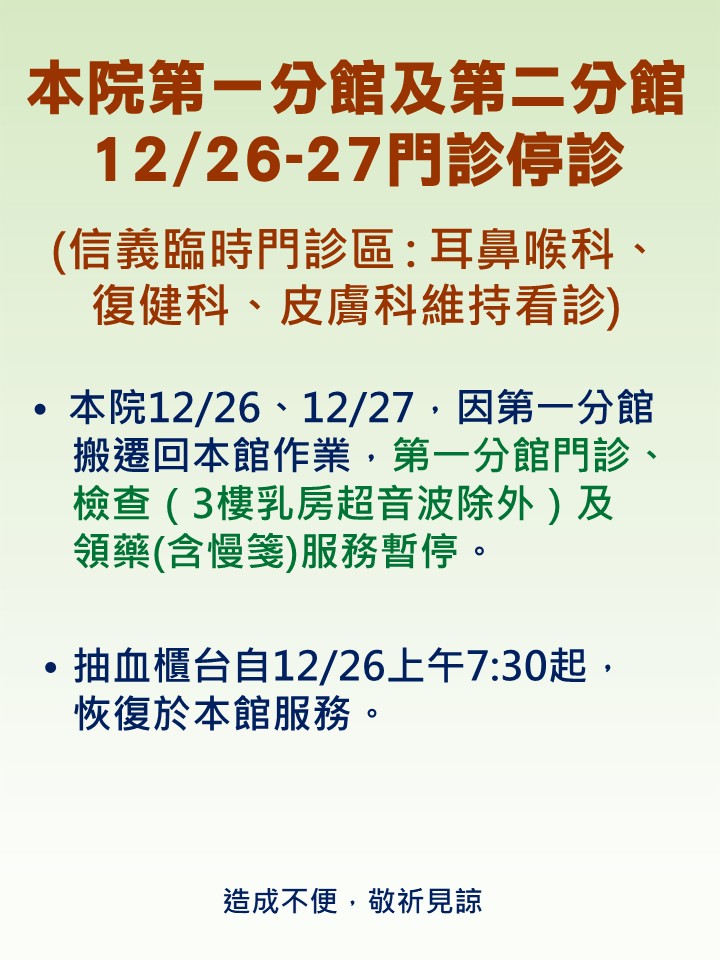 配合第一分館搬遷,本院12/26-27門診停診(信義臨時門診區維持看診)